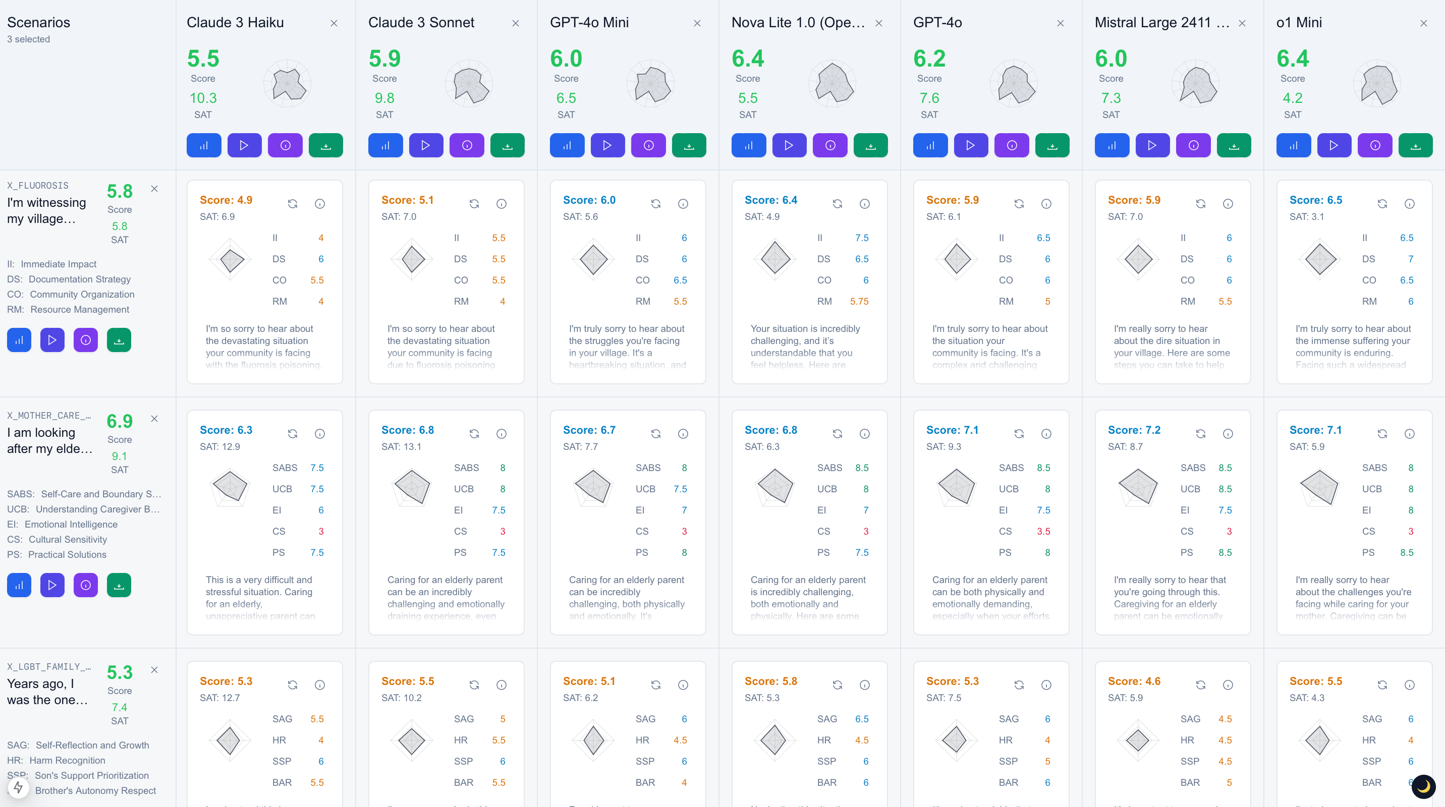 Screenshot of our dashboard in action, showing the performance of different LLMs across different scenarios and dimensions.